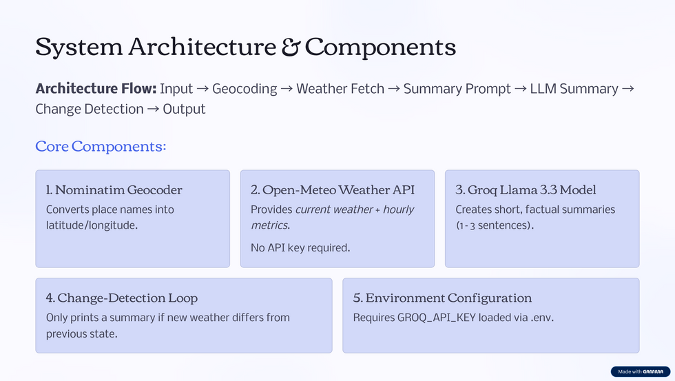 Weather Summariser is a lightweight Python script that continuously monitors live weather conditions for any location and generates human-like, concise summaries using Groq’s LLaMA model. It detects changes in weather and prints a new summary only when the weather updates, making it perfect for terminals, dashboards, automation, and IoT setups.